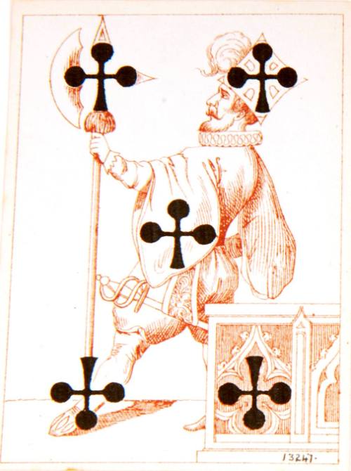 Description5 of clubs represented as a court figure in costume. There is a red pattern on the reverse.On View