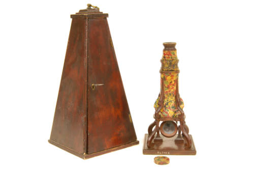 DescriptionMahogany case of the microscope (C4700A) made by Richard Cuming at the age of 15 in 1792. It includers a sqaure drawer inside, with compartments filled with microscope equipment, information and slides.On View