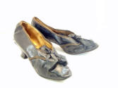 DescriptionHeeled ladies shoes. Made of black leather, once patent, with a large black ribbon bow at the front of the shoe. Worn by Eliza Sanwell on her wedding day, 1893.On View