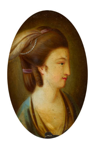 DescriptionOval portrait of a woman that has been half-varnished. It has a finger print mark on the top varnished section revealing the paint layer underneath. This suggests that the varnish has been half-applied, not half-removed. On View