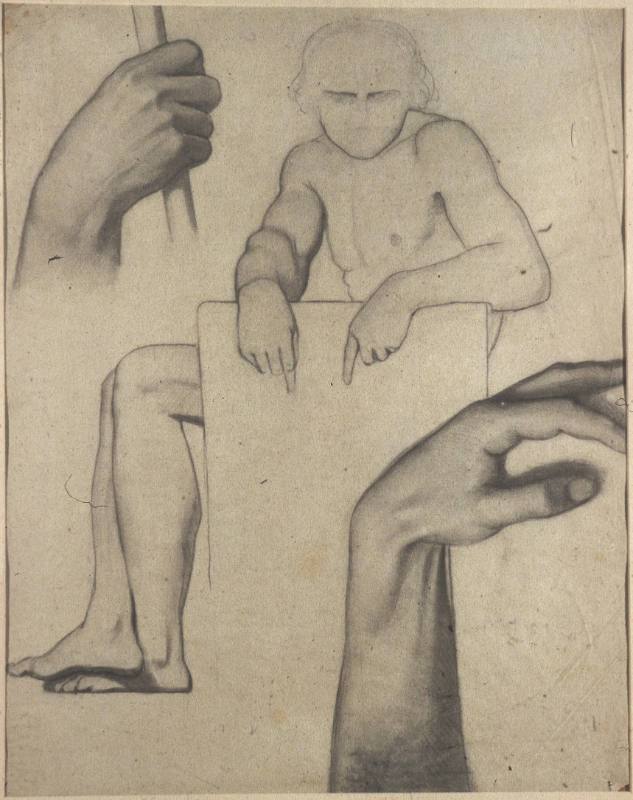 Description(Recto) Seated nude figure for Erudition; right hand clutching staff, possibly for centre Bishop; left hand and part of arm for Wisdom.