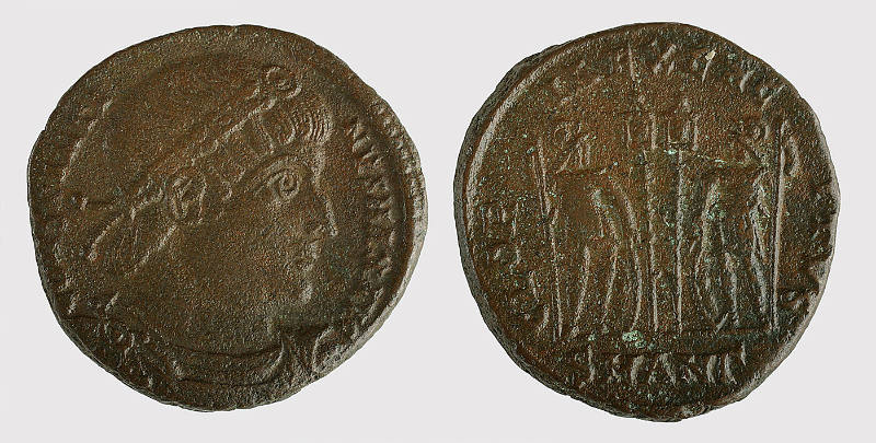 DescriptionObverse Description: bust facing right. Around: CONSTANTI NY…wornReverse Description: two figures holding spears facing eachother, two poles in between them. In exergue: SMNA. Around: CLOP IABX…worn