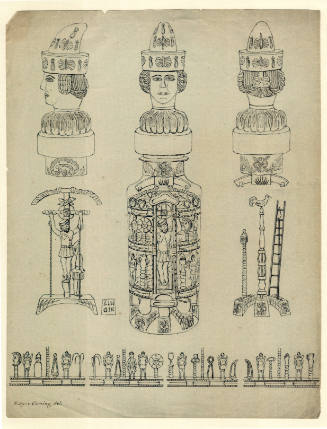 DescriptionObverse Description: X shape met by wide V shape and two flowersReverse Description: 3/4 view of animal emerging from left side looking backward