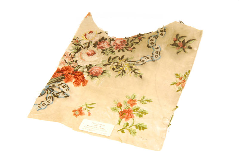 DescriptionPart of a dress worn by Queen Charlotte. The fabric is from the side of the bodice, with an underarm section in cream-coloured satin brocaide. It is decorated with flowers of satin and chenille in green, peach, white, pink and yellow colours, and fastened with a blue bow. It was purchased at the sale of her effects.On View